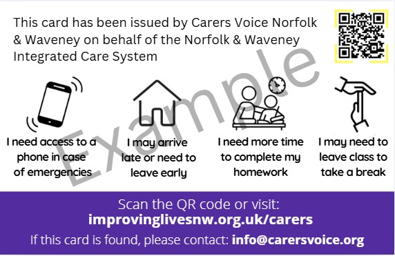 The All Age Carers Identity Passport, co-produced by Carers Voice Norfolk and Waveney, will now include additional icons and information to support Young Carers. This tailored card for Young Carers launched earlier this month.